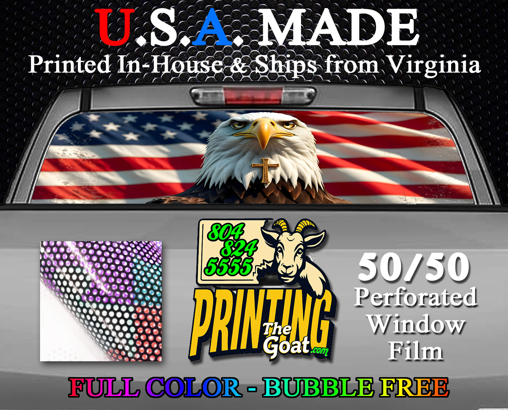 American Flag Bald Eagle and Cross Rear Truck Window 50/50 Perforated Sticker