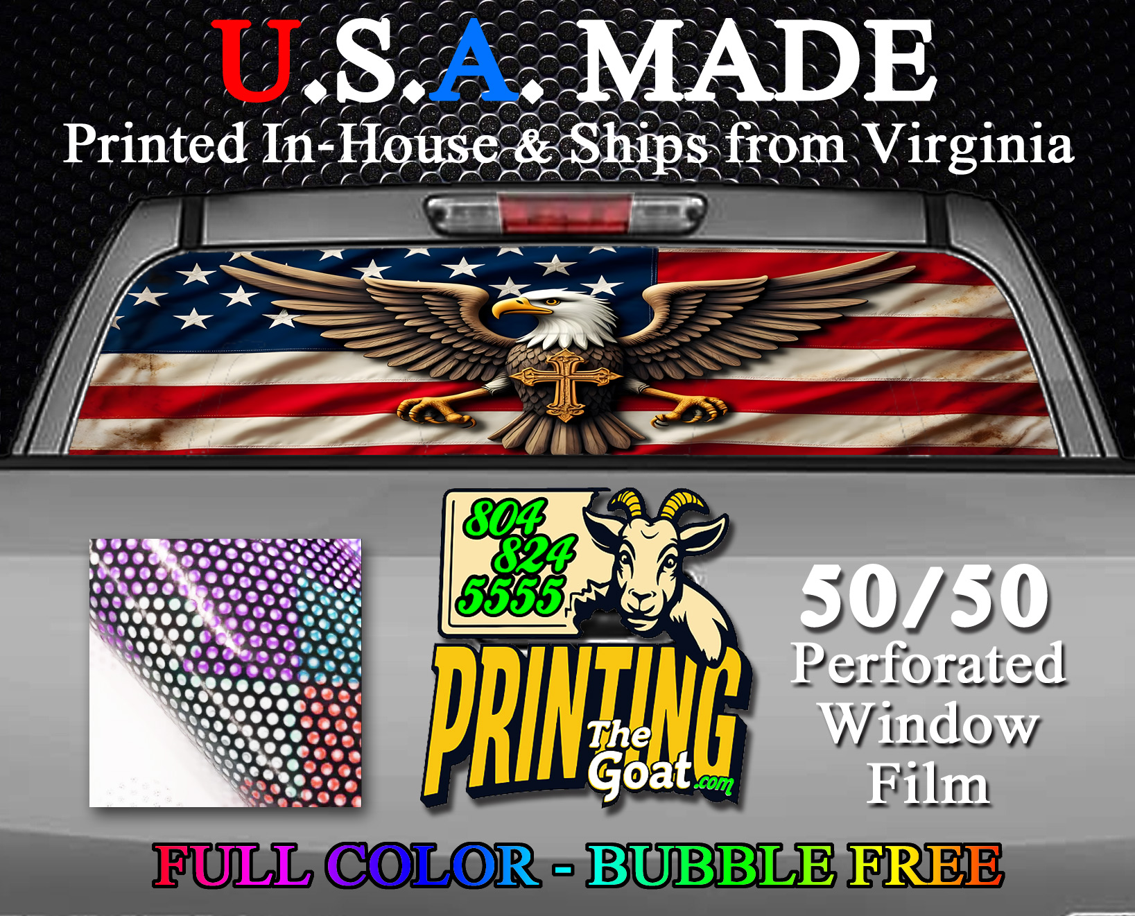 American Flag Bald Eagle and Cross Rear Truck Window 50/50 Perforated Sticker